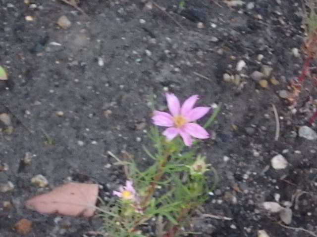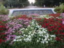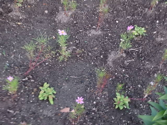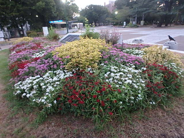 どんよりと曇った蒸し暑い朝でした。噴水東側の花壇のヒマワリの次にコスモスなどが植えられたようです。