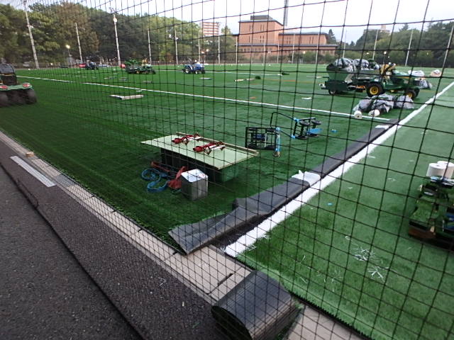 今日も猛暑の朝でした。テラスポ鶴舞の人工芝の貼り替え工事はラインがきれいにひかれて完成間近のようでした。