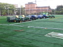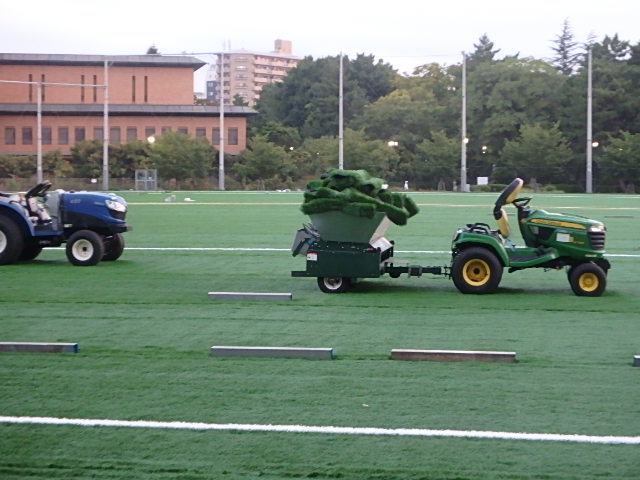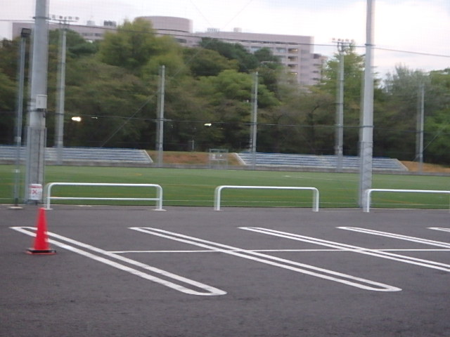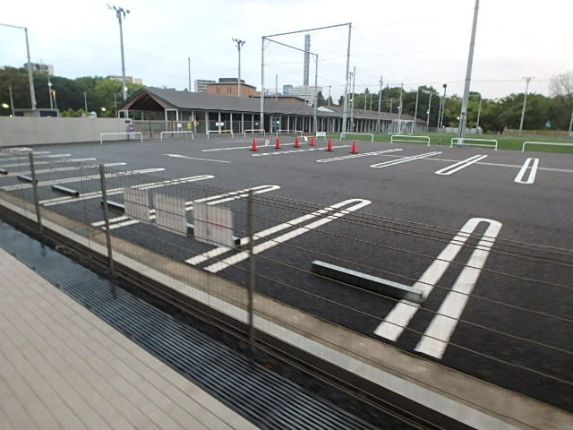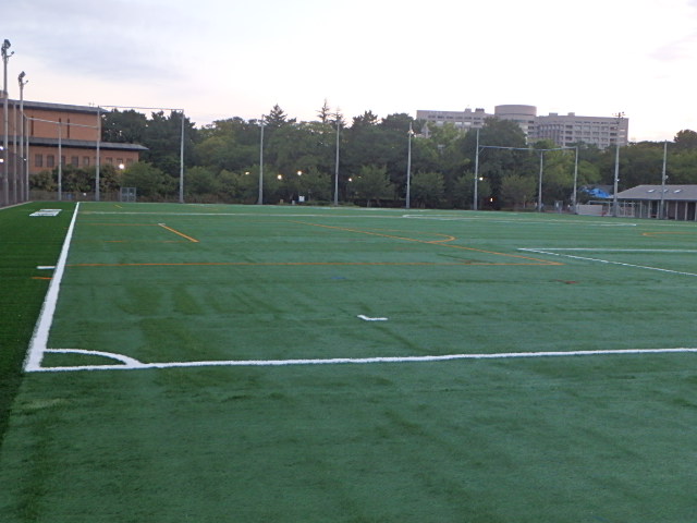 曇って涼しい雨上がりの朝でした。西側が終了したテラスポ鶴舞の人工芝の貼り替え工事で駐車場を占有していた備品がすっかり撤収されたので東側のグラウンドは今回は行わないようでした。