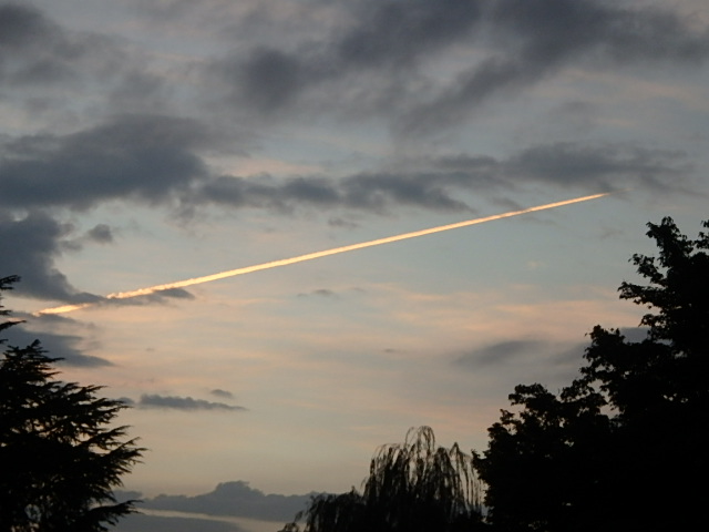 猛暑の夜明けの空に飛行機雲がどんどん伸びていました。テラスポ鶴舞の人工芝の貼り替え工事は完成したようでした。もう一面サッカーグラウンドがありますがそちらも工事するのでしょうか。