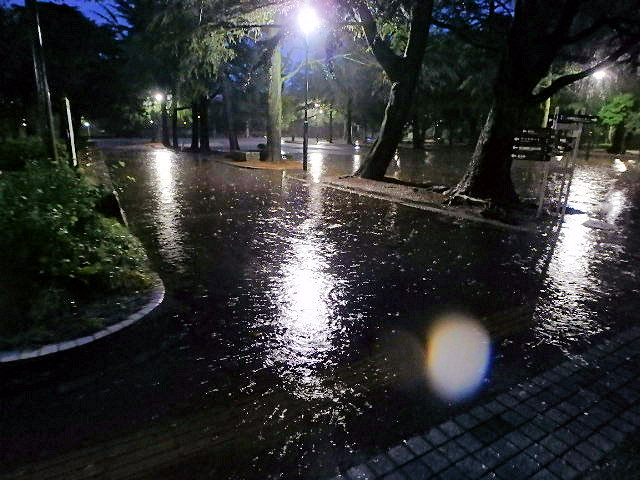 台風接近中で土砂降りの朝でした。昨夜の雨ですでにあちらこちらで冠水していました。