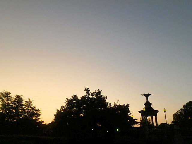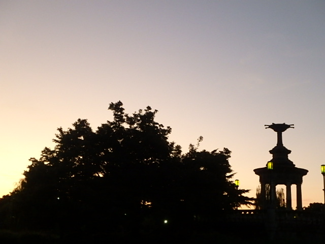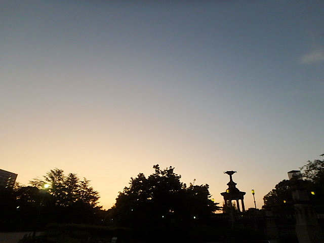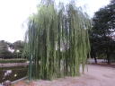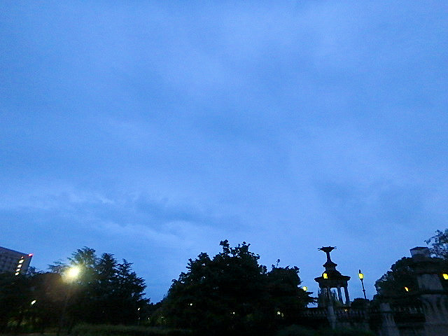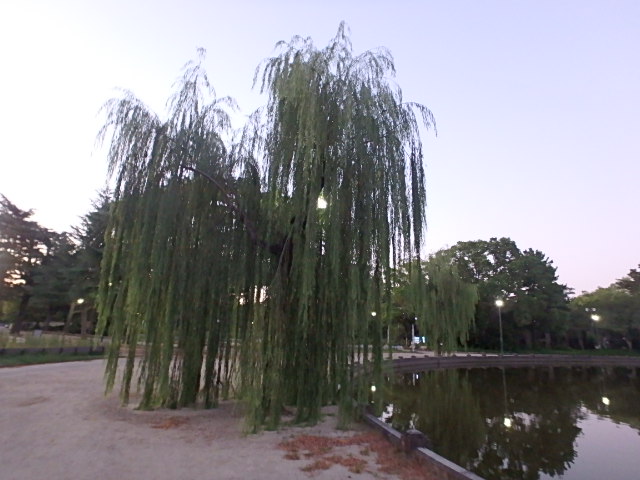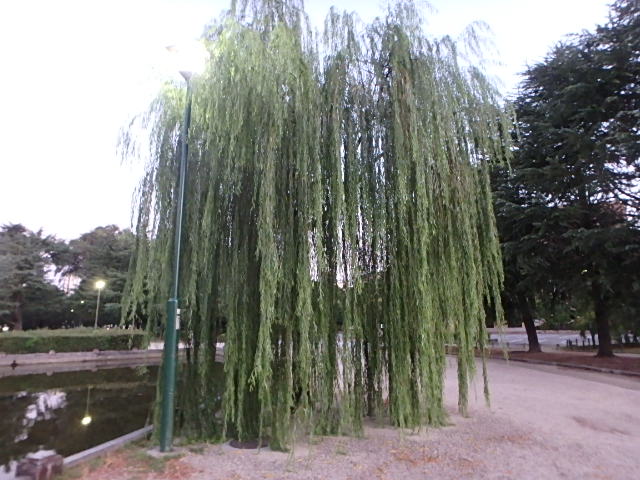 最近では驚くほど涼しい雨上がりの朝でした。噴水東側の柳がボーボーに育って葉が地面についています。