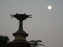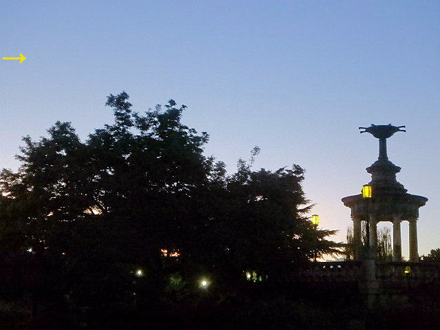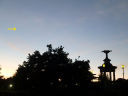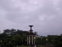 うす曇りの西の空にくっきりと月(←)が見られ噴水の池に映っていました(→)。