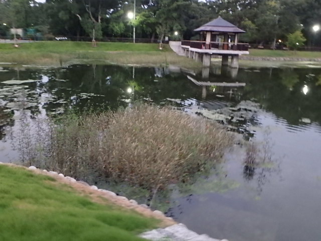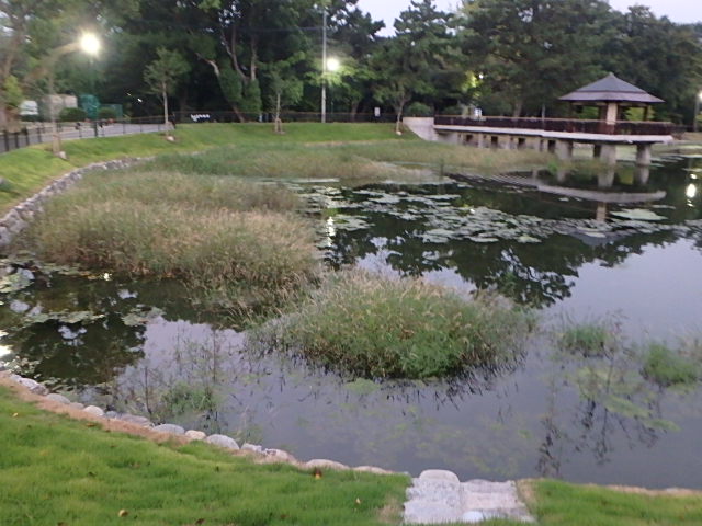 猛暑の朝が戻ってきました。改修された竜ヶ池は以前はなかった水草がボーボーに育ったままですが何か意図がありそうです。