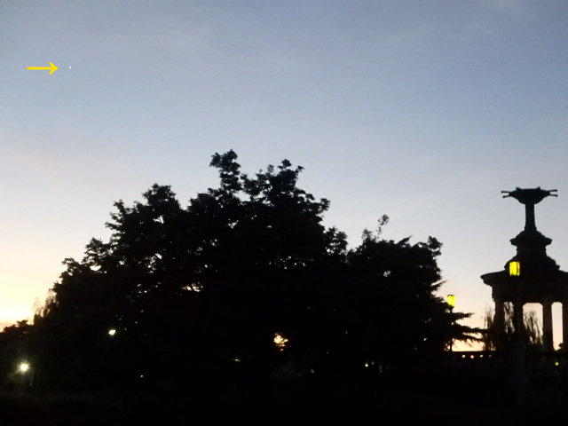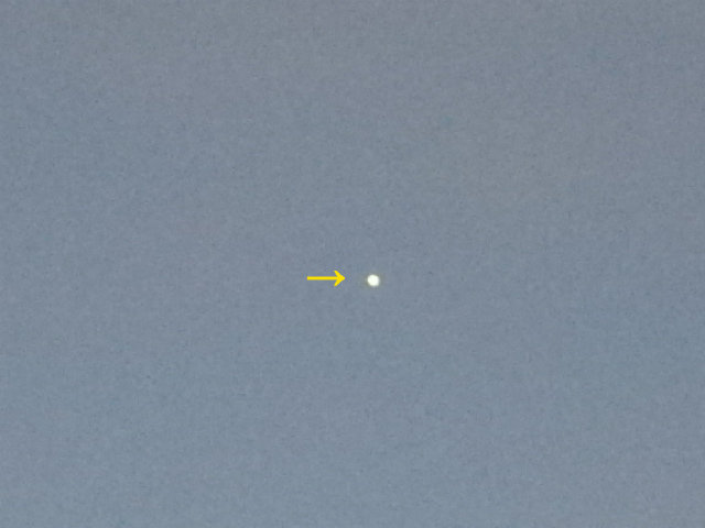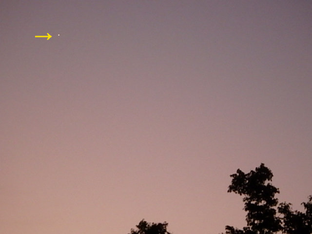 とても涼しい快晴の夜明けの空に明けの明星の金星(→)が輝いていました。